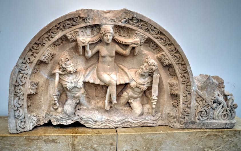 Σὲ τοξωτὸ πλαίσιο μὲ περίτεχνο γεῖσο, ἡ Ἀφροδίτη σὲ ἀνάγλυφο γυμνὴ κάθεται μὲ τὰ πόδια της σταυρωμένα σὲ κοχύλι πάνω ἀπὸ τὴν θάλασσα. Μὲ τὰ χέρια της ὑψωμένα κρατᾶ τὰ μακριά, βρεγμένα μαλλιά της.