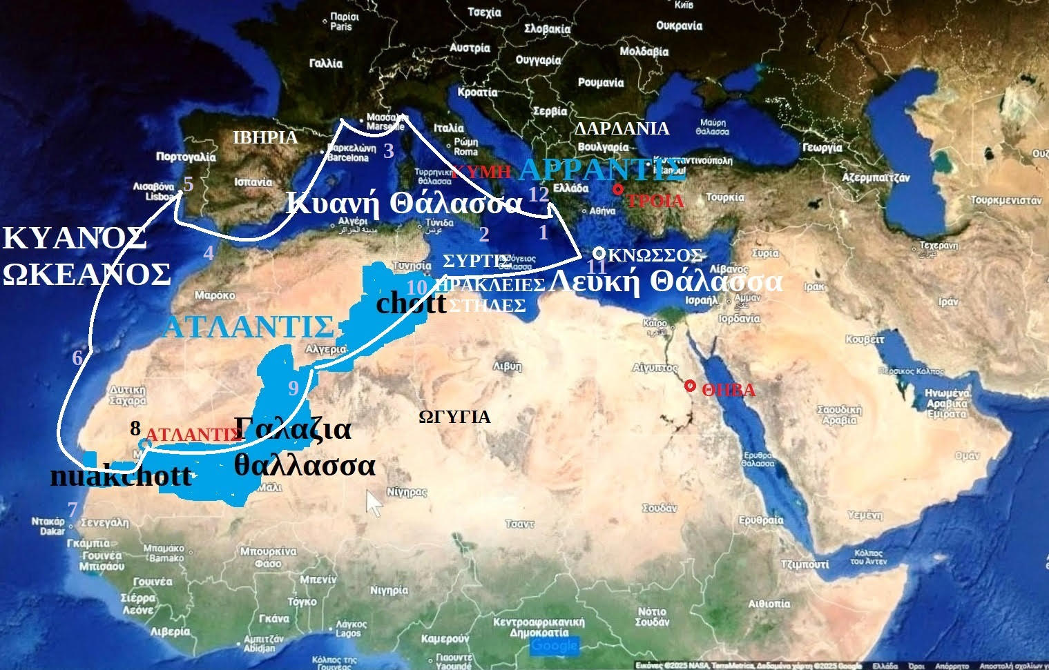 γ) Τροῖα Κέκροπα Σύρτεως (Καρθαγένης-Καρχηδόνας) πρὸς Κίτρινη καὶ Κυανῆ Θάλασσα τῆς Ἀτλαντίδας Ἑσπερίας χρυσῶν μήλων Ἑσπερίας...