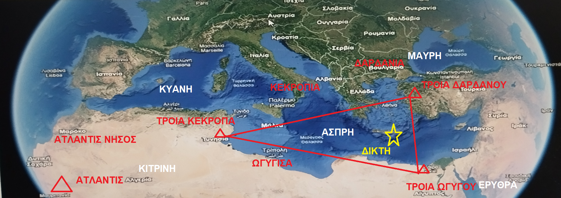 ὅπως ἡ Ἀτλαντίδα Ἴλιον τῆς γαλάζιας (ἢ κίτρινης) θάλασσας στὴν δυτικὴ πλευρὰ τῆς γαλάζιας θάλασσας κοντὰ στὸ στόμιο μὲ τὸν κυανὸ Ὠκεανὸ μὲ τοὺς ἐπιζήσαντες νὰ ἱδρύσουν τὶς τρεὶς Μετακλυσμιαῖες Τροῖες.